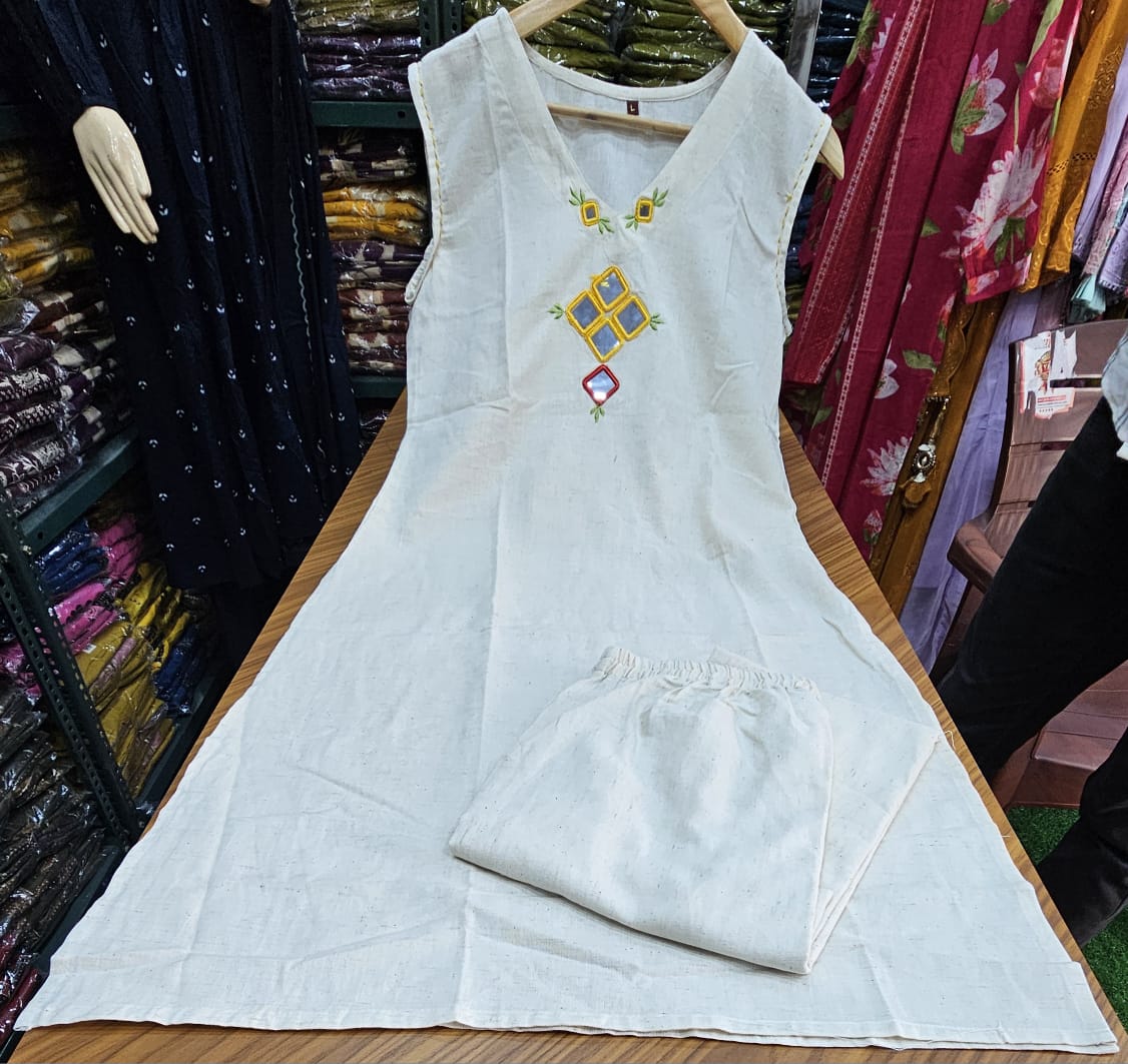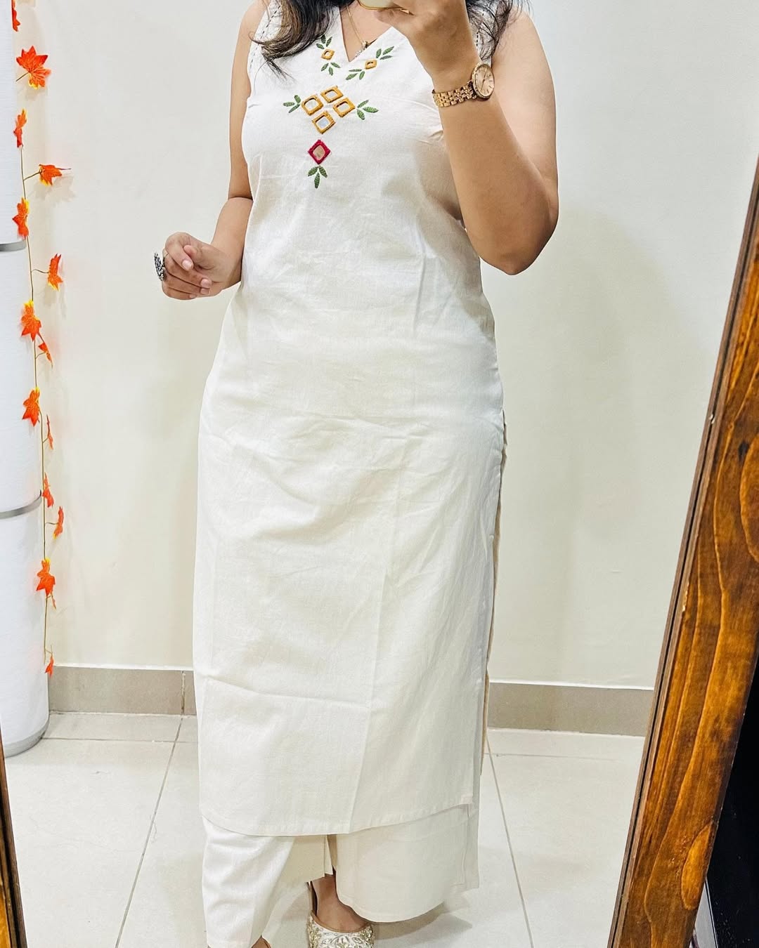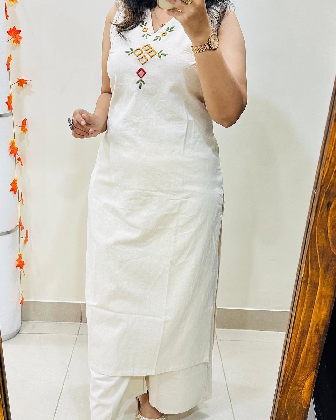 Bring home elegance with this stylish ethnic kurta and plazo set, designed to make you stand out effortlessly. Crafted in fine cotton slub fabric, this set comes with heavy embroidery work on the kurta and intricate detailing for a charming and graceful look. The mega sleeves and original abla work rings add a traditional yet stylish touch, making it perfect for festive and special occasions.