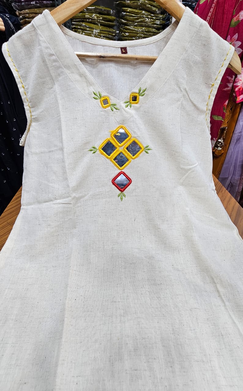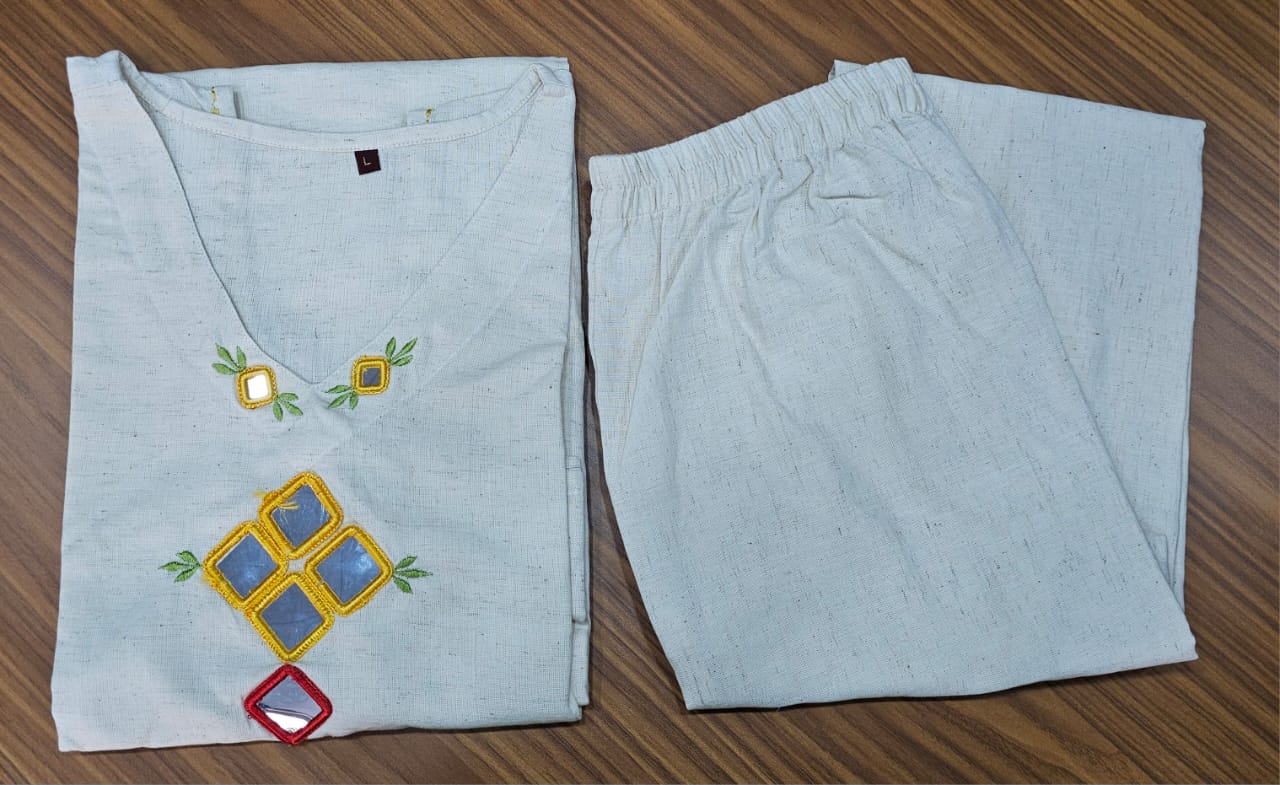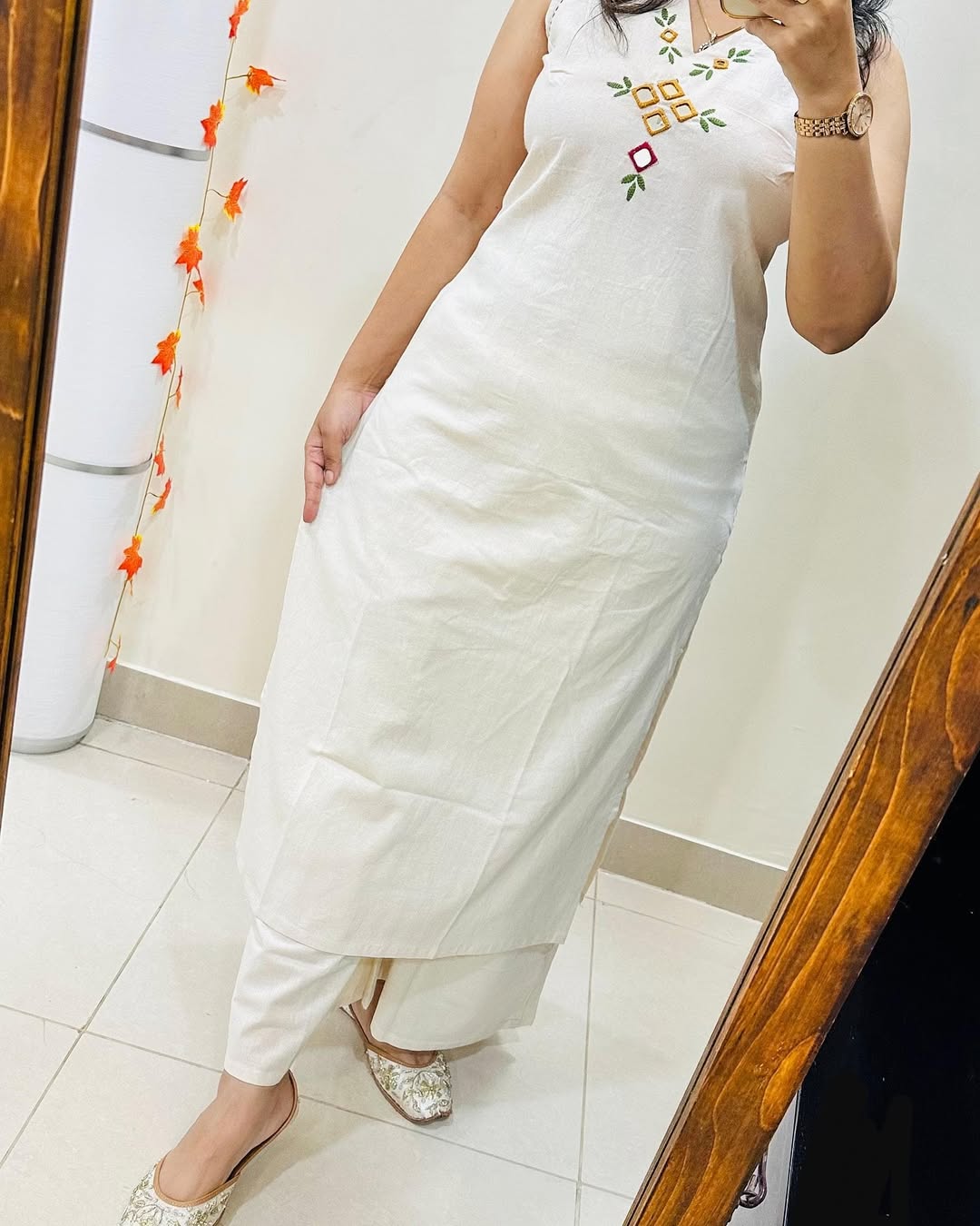 Bring home elegance with this stylish ethnic kurta and plazo set, designed to make you stand out effortlessly. Crafted in fine cotton slub fabric, this set comes with heavy embroidery work on the kurta and intricate detailing for a charming and graceful look. The mega sleeves and original abla work rings add a traditional yet stylish touch, making it perfect for festive and special occasions.