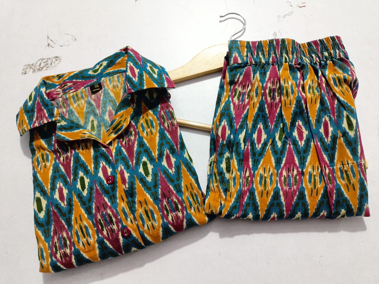 Ikat-Inspired Printed Co-Ord Set in Teal, Mustard, Rust & Maroon.