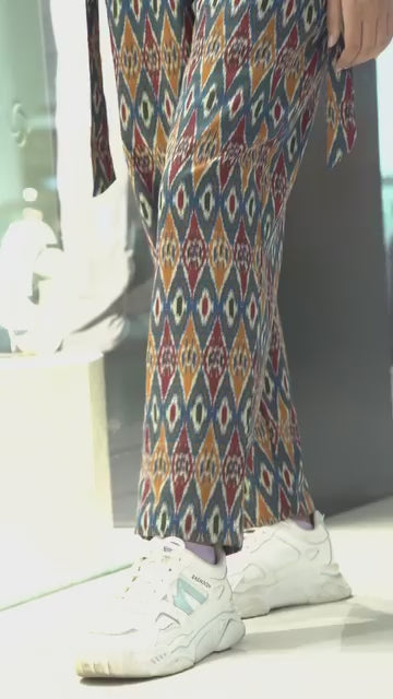 The fabric showcases a geometric Ikat-inspired diamond motif, repeating with rhythmic precision. The symmetrical, multi-coloured prints bring an ethnic richness and a contemporary vibe to the set.