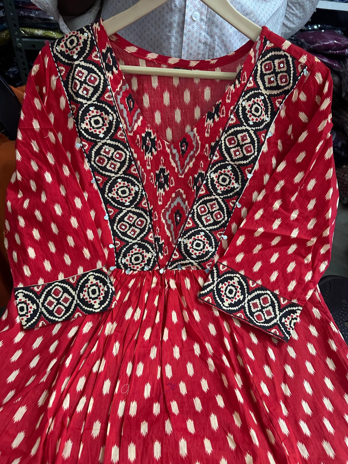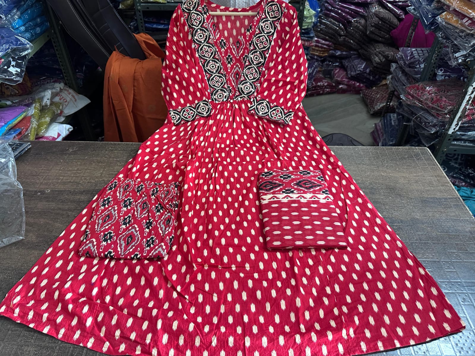 | Colour & Details | Rich red base with intricate ethnic patterns and a matching dupatta |