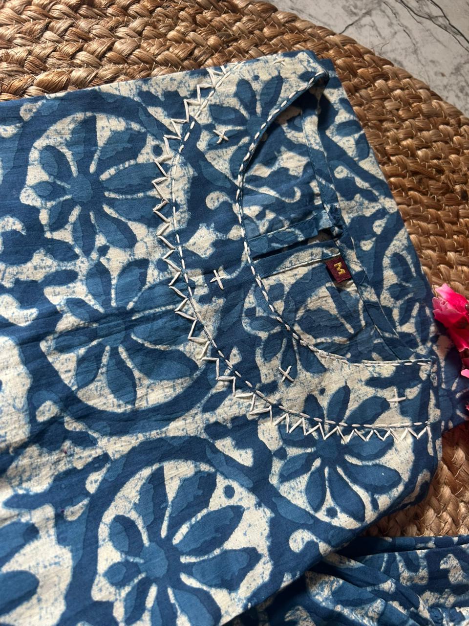 Top: Cotton kurta with side slits, backside button, pocket, and optional mega sleeves