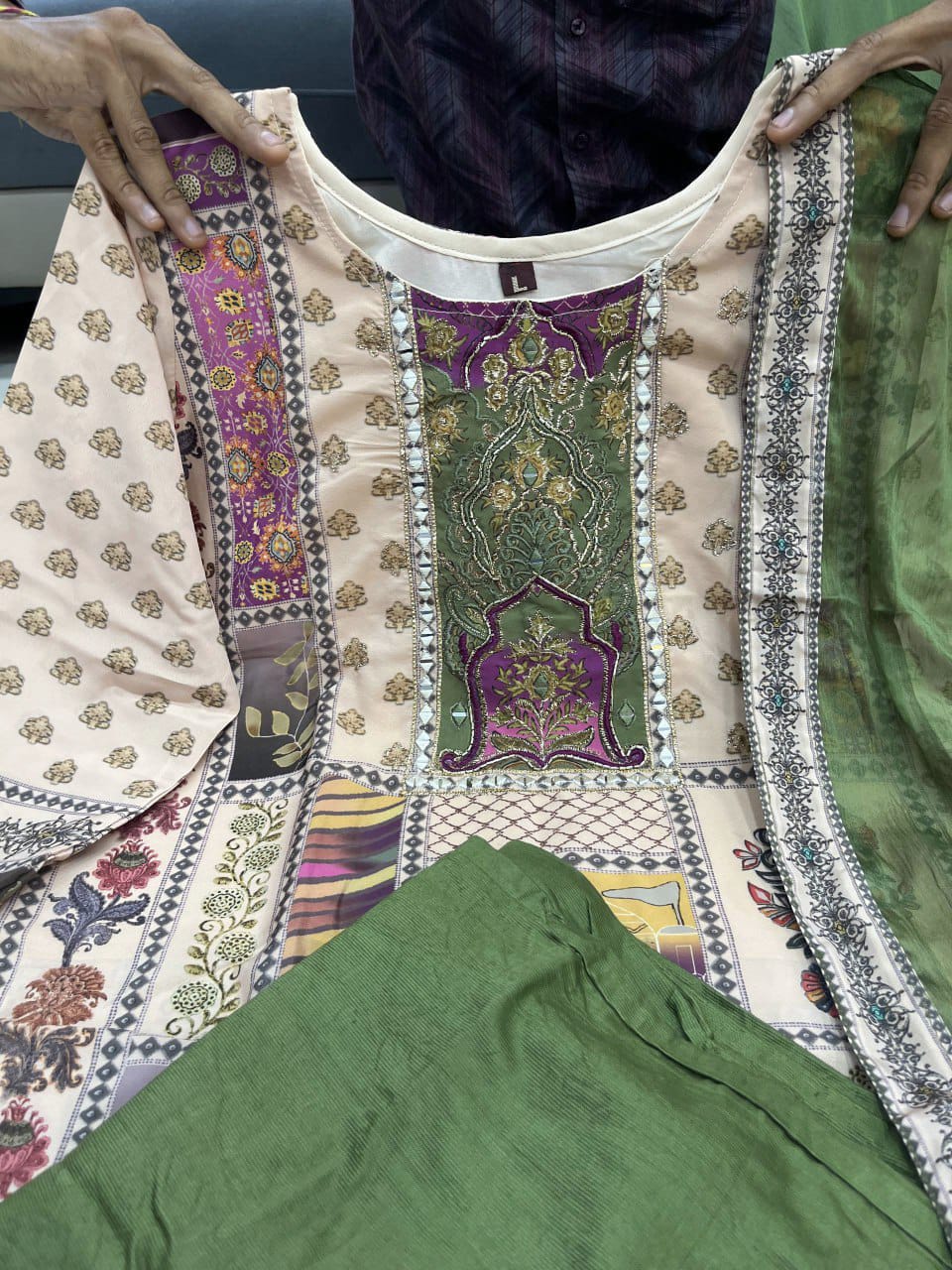 This beige kurti set blends heritage artistry with a touch of modern sophistication. Designed in a straight-fit silhouette, the kurti is adorned with vibrant patchwork motifs in maroon, olive, mustard, and violet, with tassel details on the hem for added charm. Paired with olive green embroidered pants and a soft chiffon dupatta, the set balances vibrance and elegance effortlessly. Perfect for festive evenings, cultural celebrations, and casual gatherings.