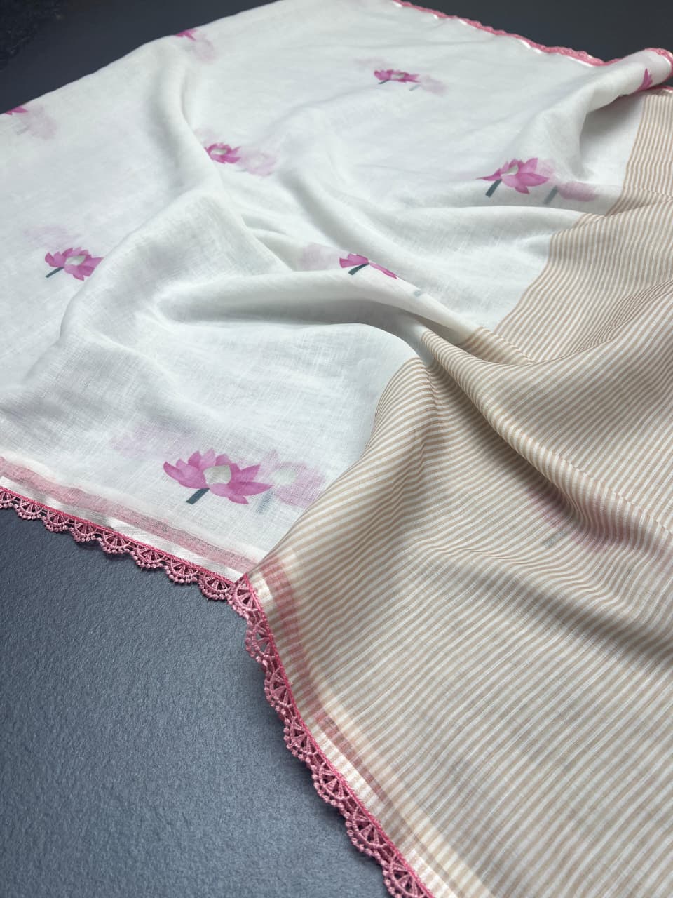 Embrace timeless sophistication with this ivory linen saree, adorned with delicate pink floral motifs that exude feminine charm. The soft, flowing fabric drapes effortlessly, creating a graceful silhouette for any occasion. A subtle pink scalloped lace border adds refinement, perfectly complementing the solid pink blouse in Banglori satin. Ideal for festive gatherings, daytime celebrations, or elegant evening affairs, this saree balances traditional grace with modern minimalism.